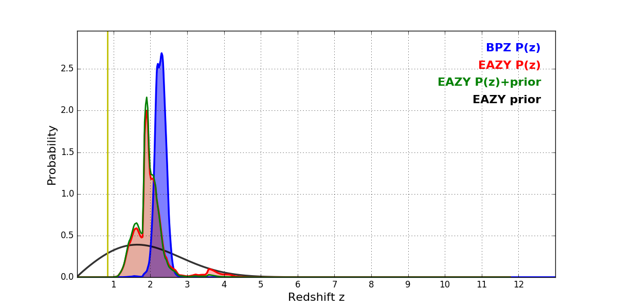In P(z) plots: Yellow lines mark the cluster redshift z = 0.833,