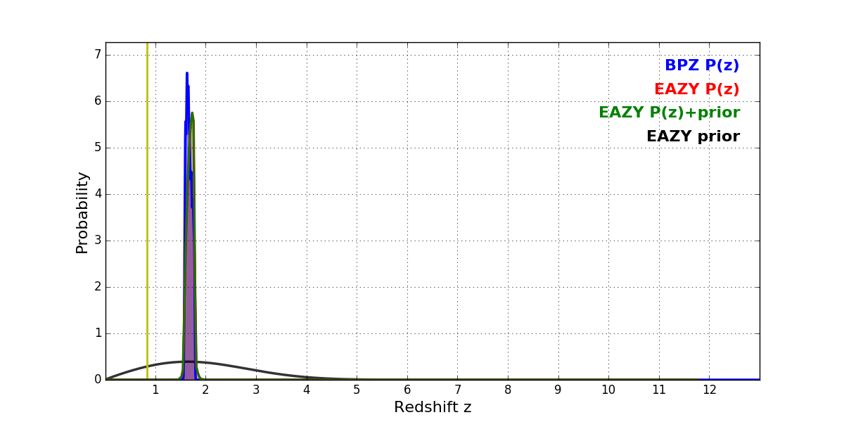 In P(z) plots: Yellow lines mark the cluster redshift z = 0.833,