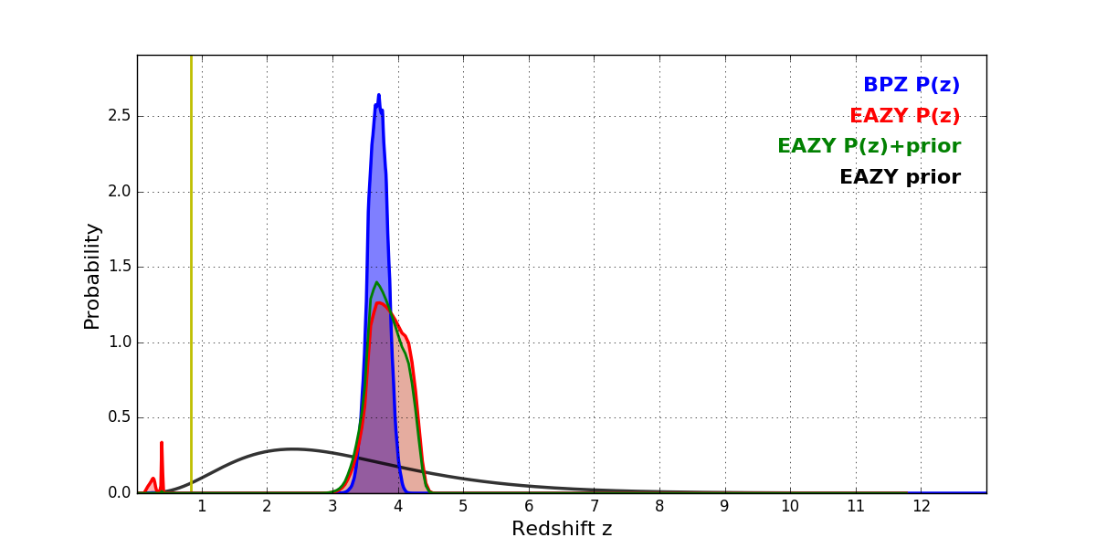 In P(z) plots: Yellow lines mark the cluster redshift z = 0.833,