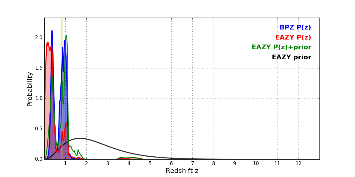 In P(z) plots: Yellow lines mark the cluster redshift z = 0.833,