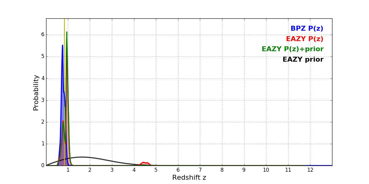In P(z) plots: Yellow lines mark the cluster redshift z = 0.833,