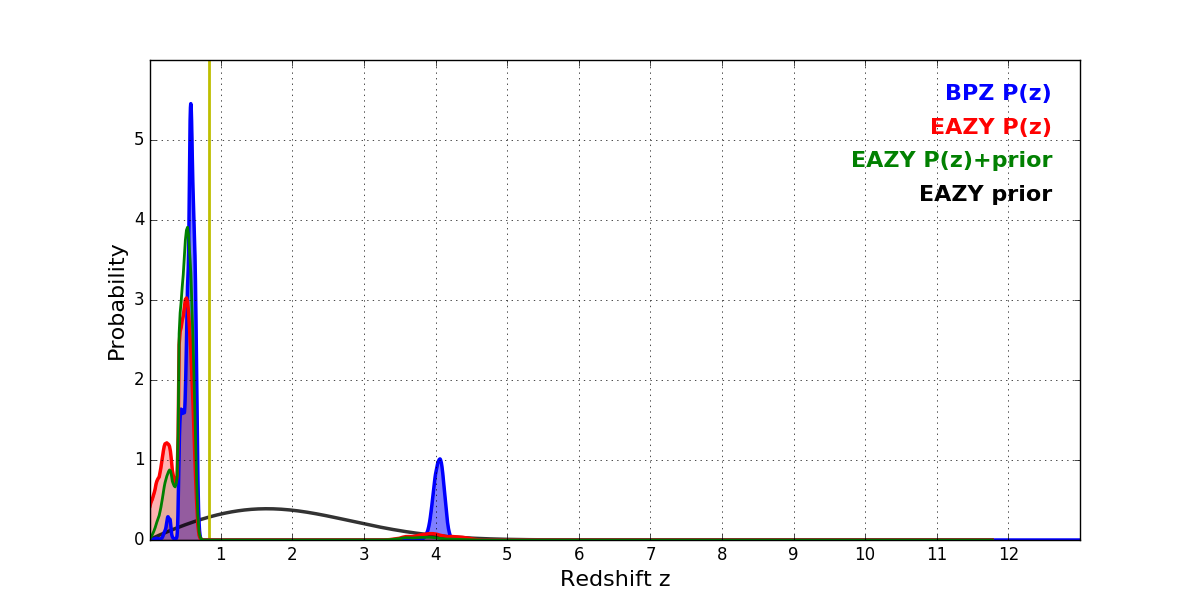 In P(z) plots: Yellow lines mark the cluster redshift z = 0.833,