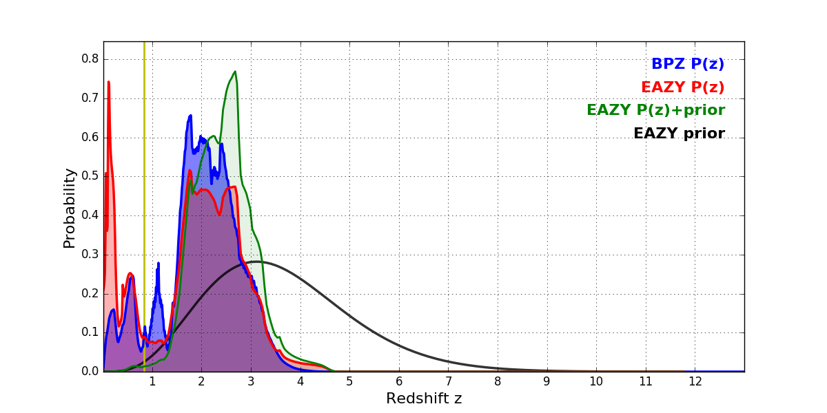 In P(z) plots: Yellow lines mark the cluster redshift z = 0.833,