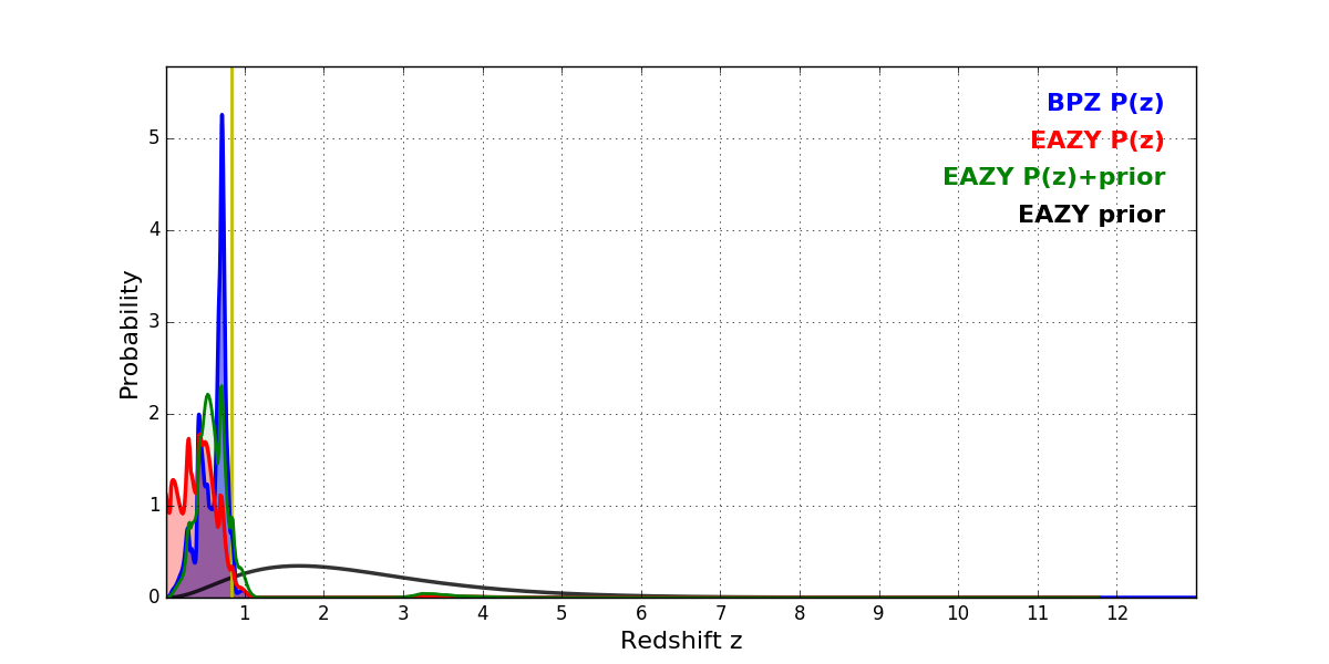 In P(z) plots: Yellow lines mark the cluster redshift z = 0.833,