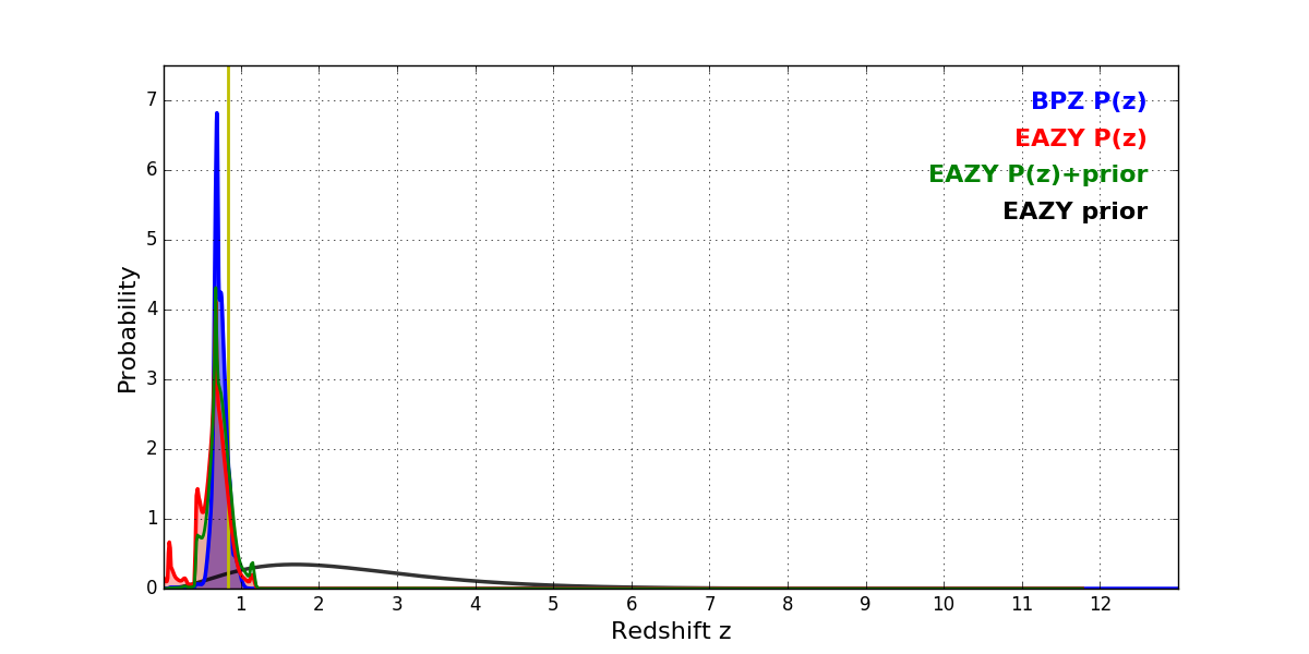 In P(z) plots: Yellow lines mark the cluster redshift z = 0.833,