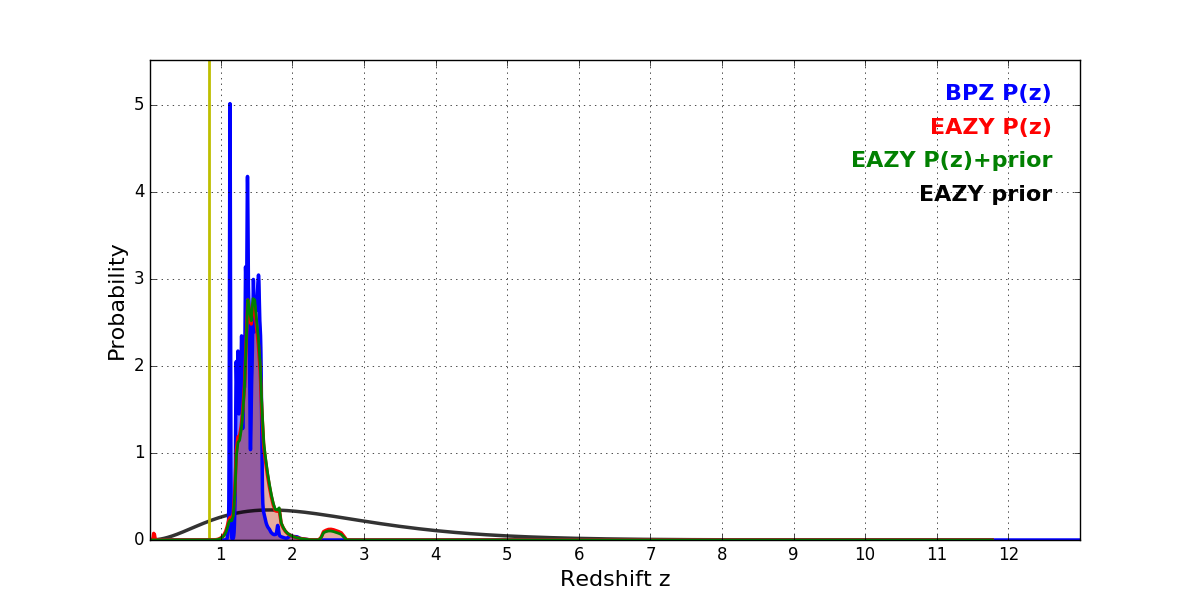 In P(z) plots: Yellow lines mark the cluster redshift z = 0.833,