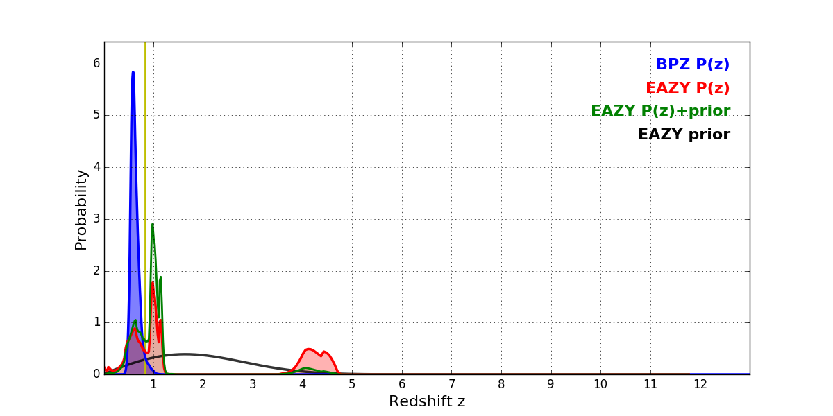 In P(z) plots: Yellow lines mark the cluster redshift z = 0.833,