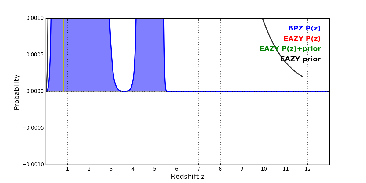 In P(z) plots: Yellow lines mark the cluster redshift z = 0.833,