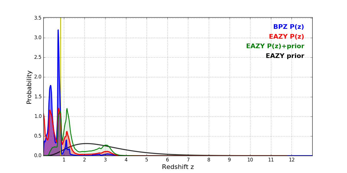 In P(z) plots: Yellow lines mark the cluster redshift z = 0.833,