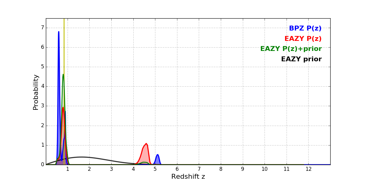 In P(z) plots: Yellow lines mark the cluster redshift z = 0.833,