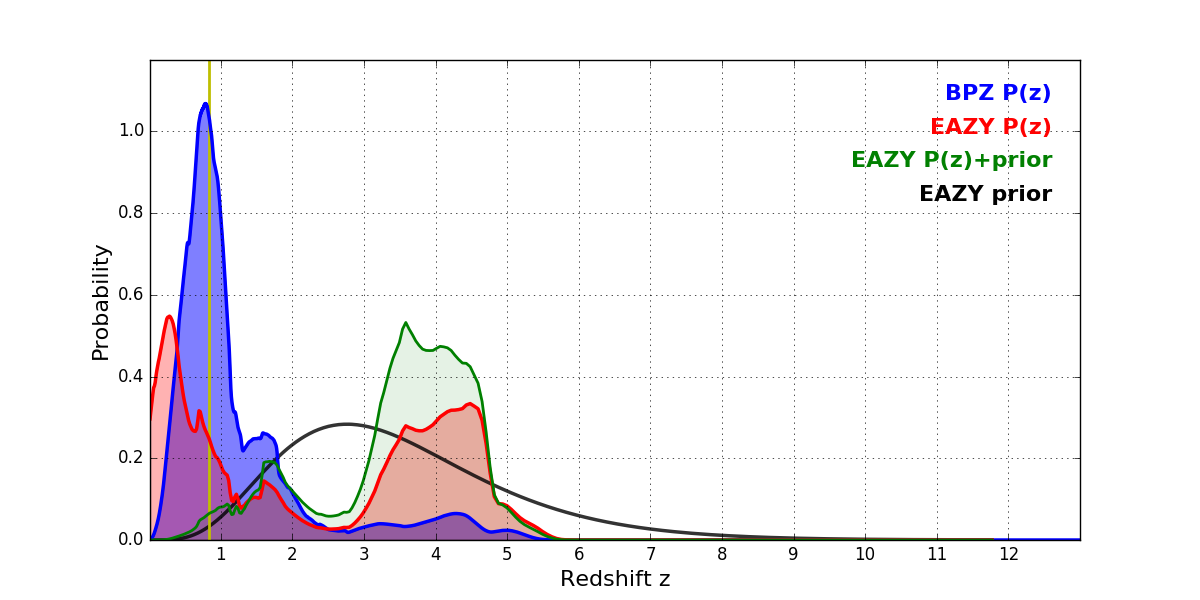 In P(z) plots: Yellow lines mark the cluster redshift z = 0.833,
