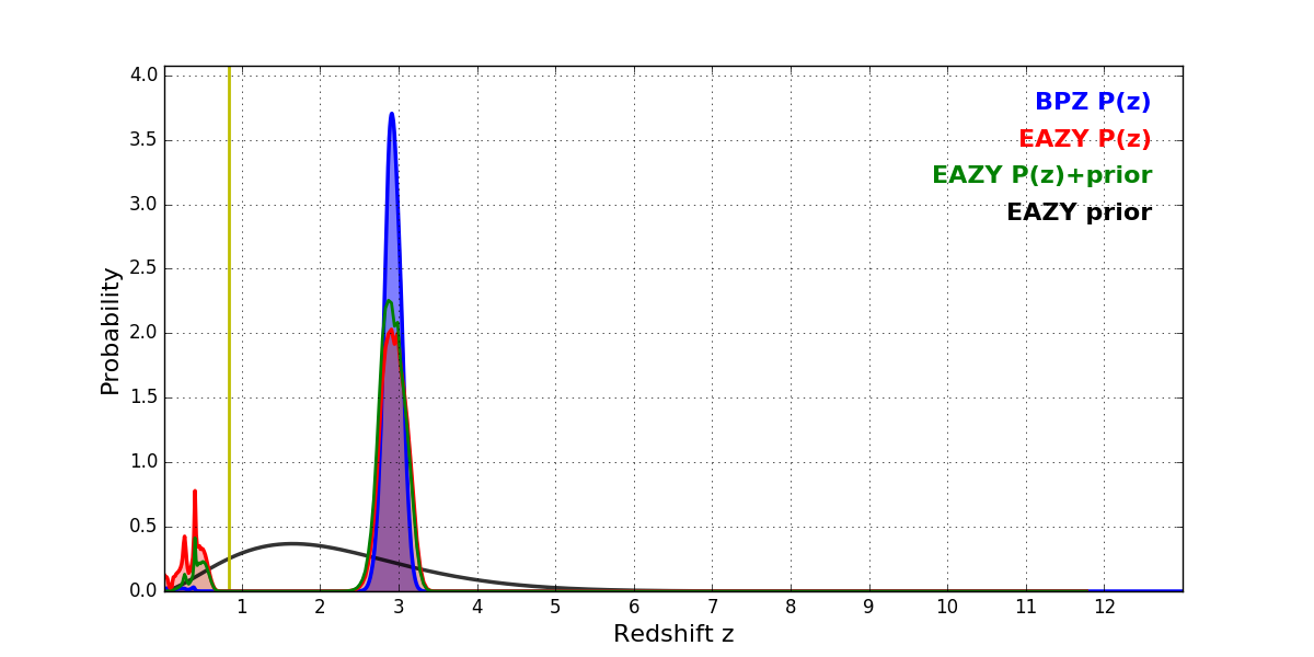In P(z) plots: Yellow lines mark the cluster redshift z = 0.833,