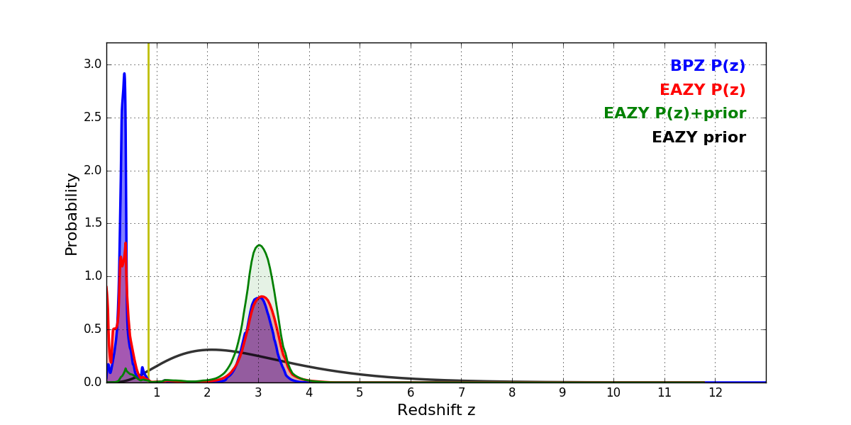 In P(z) plots: Yellow lines mark the cluster redshift z = 0.833,