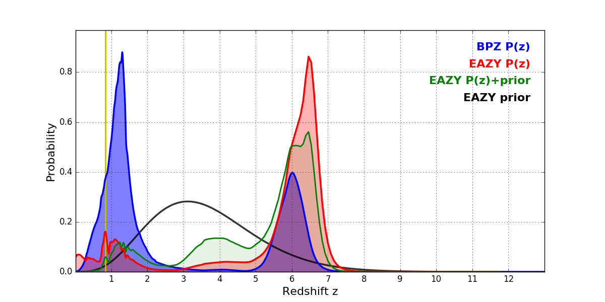 In P(z) plots: Yellow lines mark the cluster redshift z = 0.833,