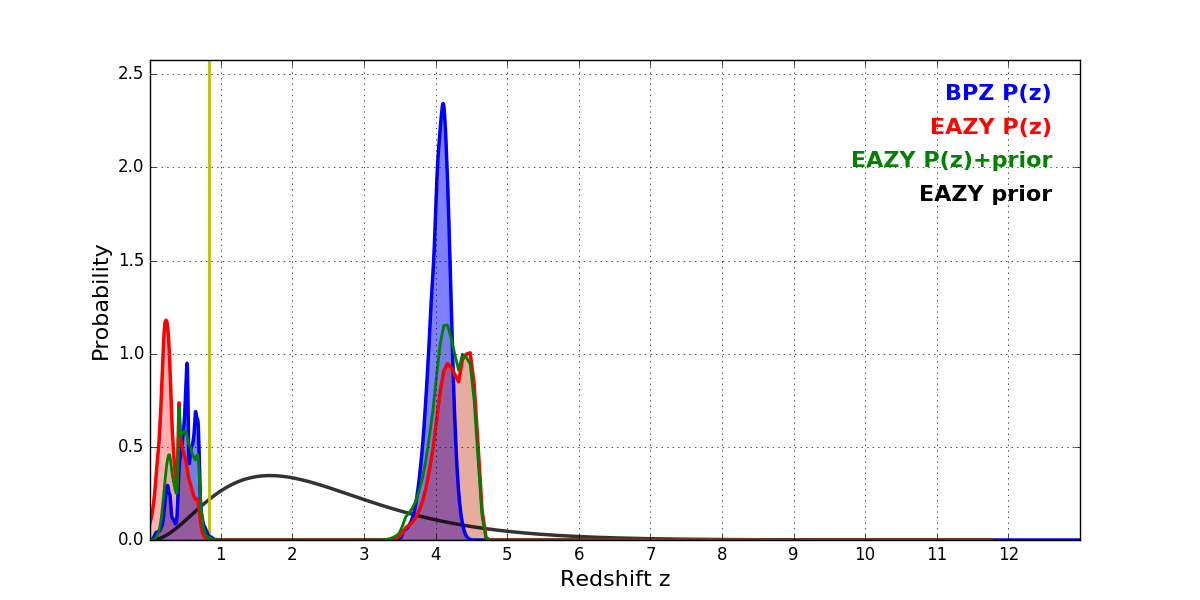 In P(z) plots: Yellow lines mark the cluster redshift z = 0.833,