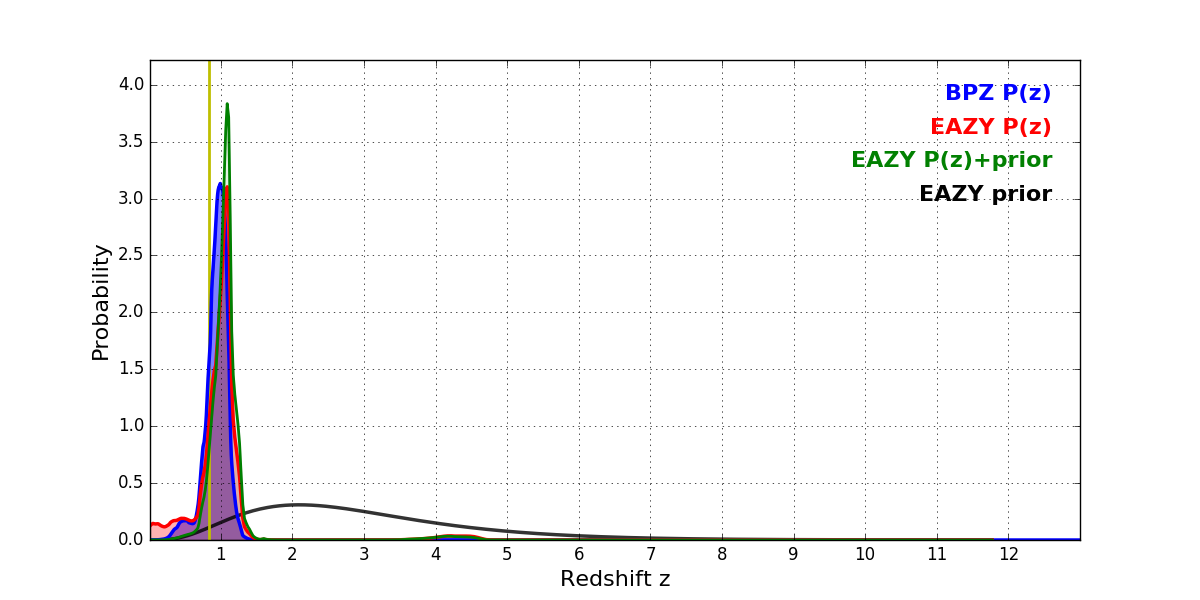 In P(z) plots: Yellow lines mark the cluster redshift z = 0.833,