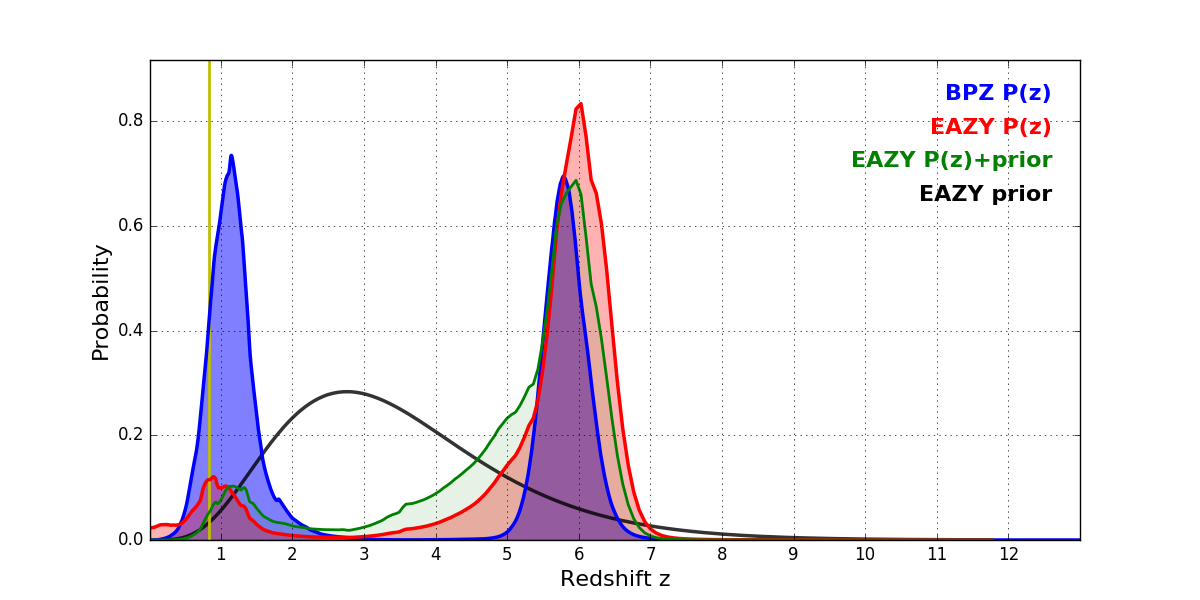 In P(z) plots: Yellow lines mark the cluster redshift z = 0.833,