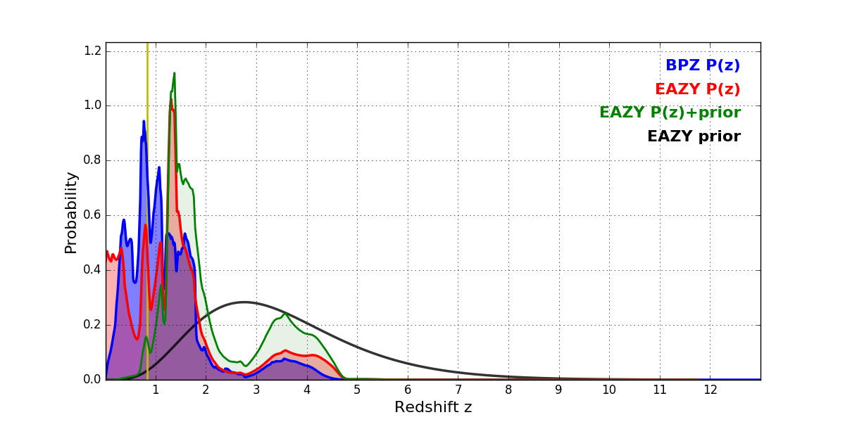 In P(z) plots: Yellow lines mark the cluster redshift z = 0.833,