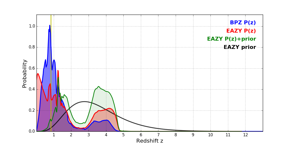 In P(z) plots: Yellow lines mark the cluster redshift z = 0.833,