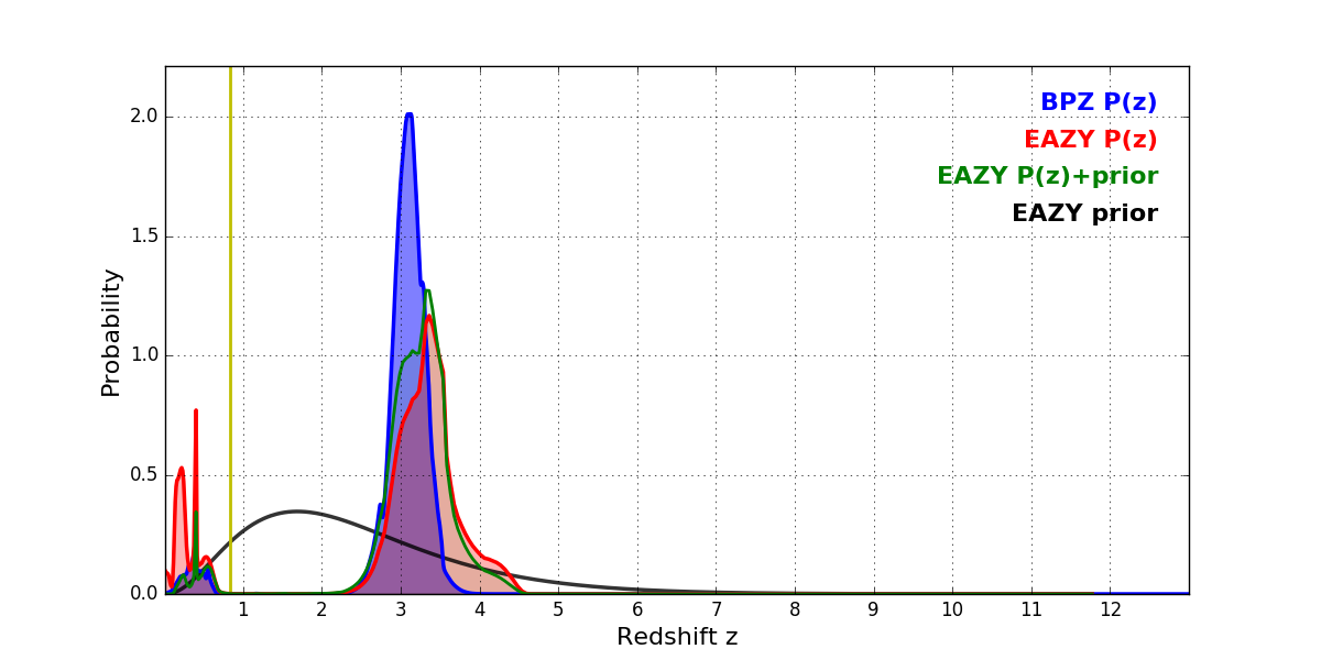 In P(z) plots: Yellow lines mark the cluster redshift z = 0.833,