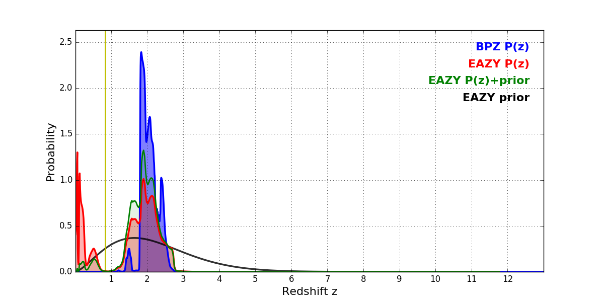 In P(z) plots: Yellow lines mark the cluster redshift z = 0.833,