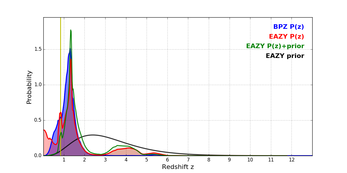 In P(z) plots: Yellow lines mark the cluster redshift z = 0.833,