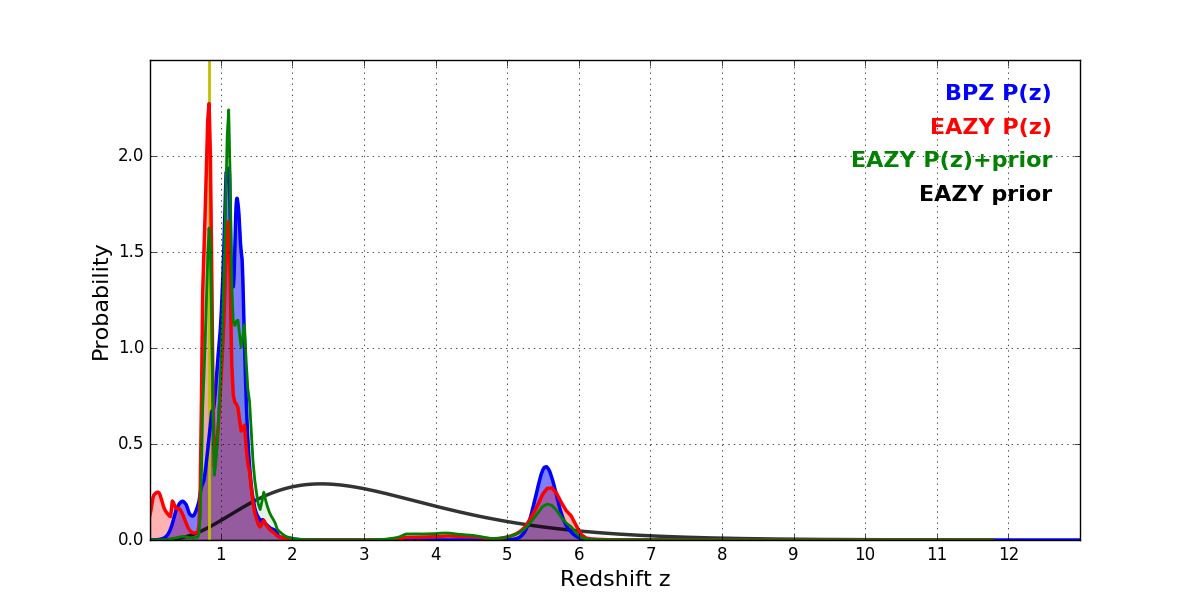 In P(z) plots: Yellow lines mark the cluster redshift z = 0.833,