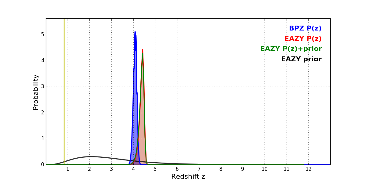 In P(z) plots: Yellow lines mark the cluster redshift z = 0.833,