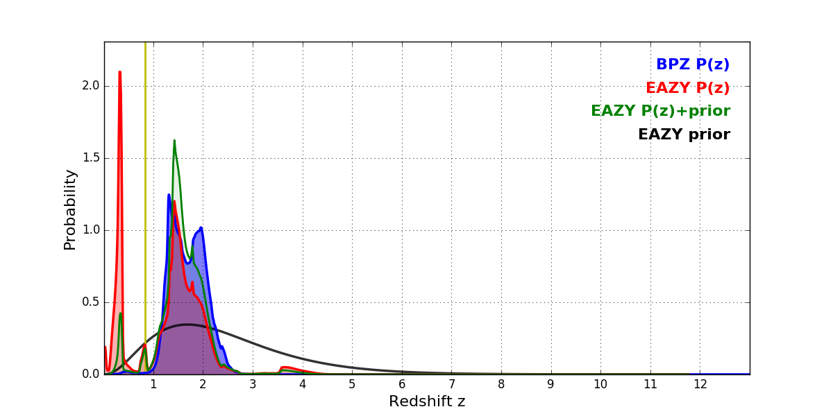 In P(z) plots: Yellow lines mark the cluster redshift z = 0.833,