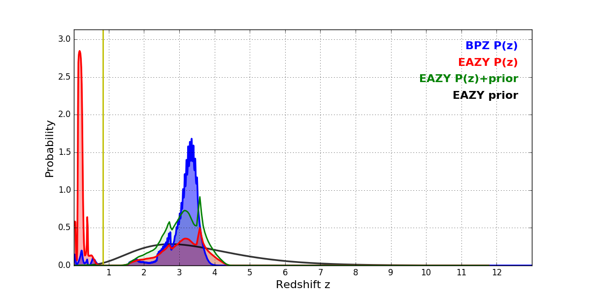 In P(z) plots: Yellow lines mark the cluster redshift z = 0.833,