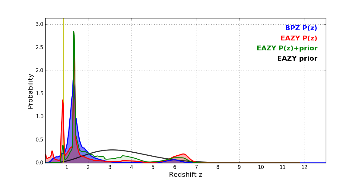 In P(z) plots: Yellow lines mark the cluster redshift z = 0.833,