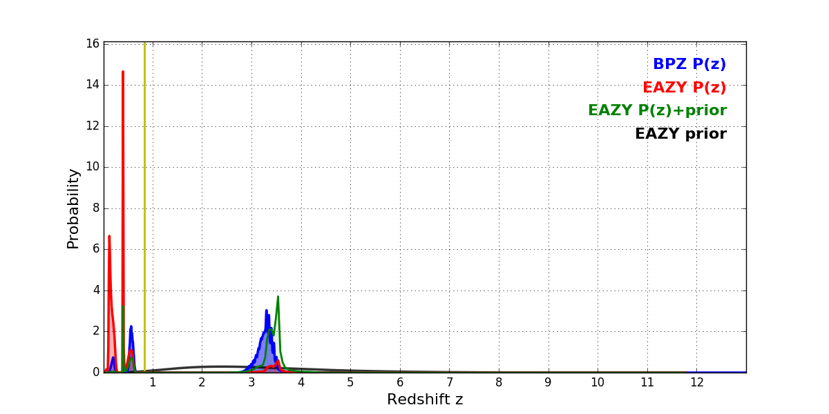 In P(z) plots: Yellow lines mark the cluster redshift z = 0.833,