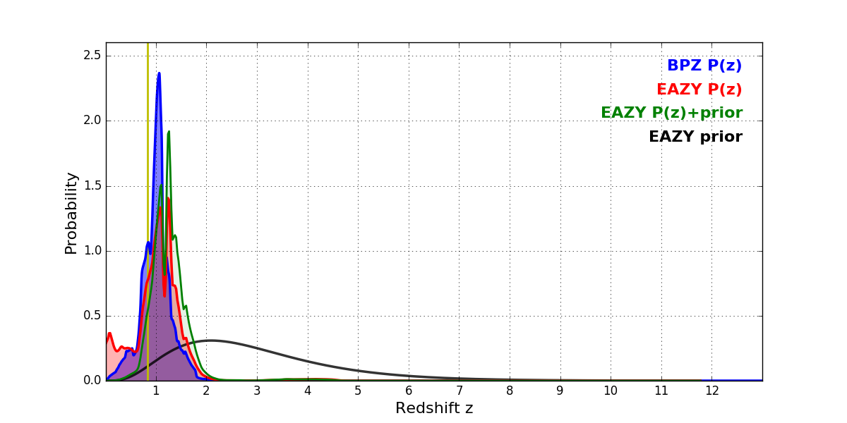 In P(z) plots: Yellow lines mark the cluster redshift z = 0.833,