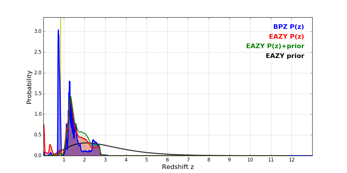 In P(z) plots: Yellow lines mark the cluster redshift z = 0.833,