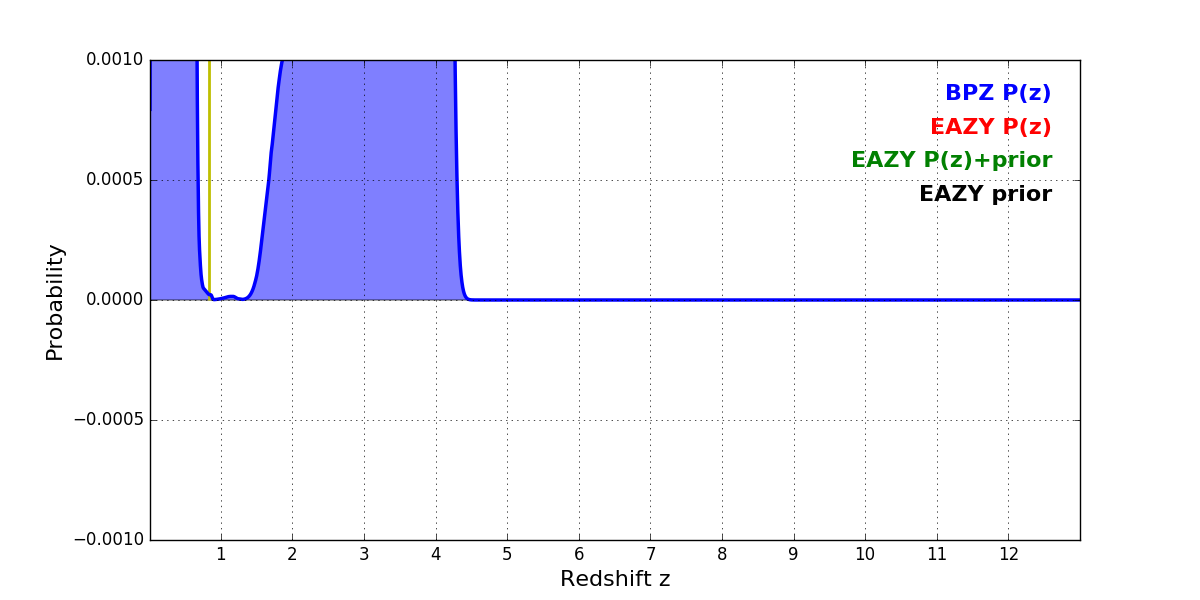 In P(z) plots: Yellow lines mark the cluster redshift z = 0.833,