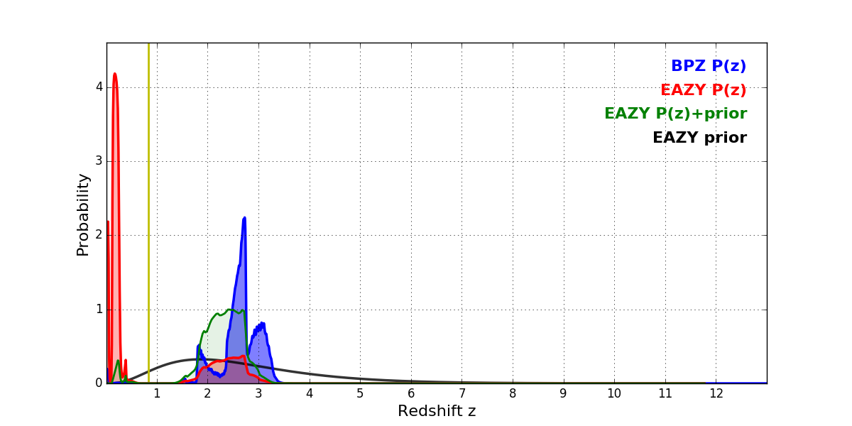 In P(z) plots: Yellow lines mark the cluster redshift z = 0.833,