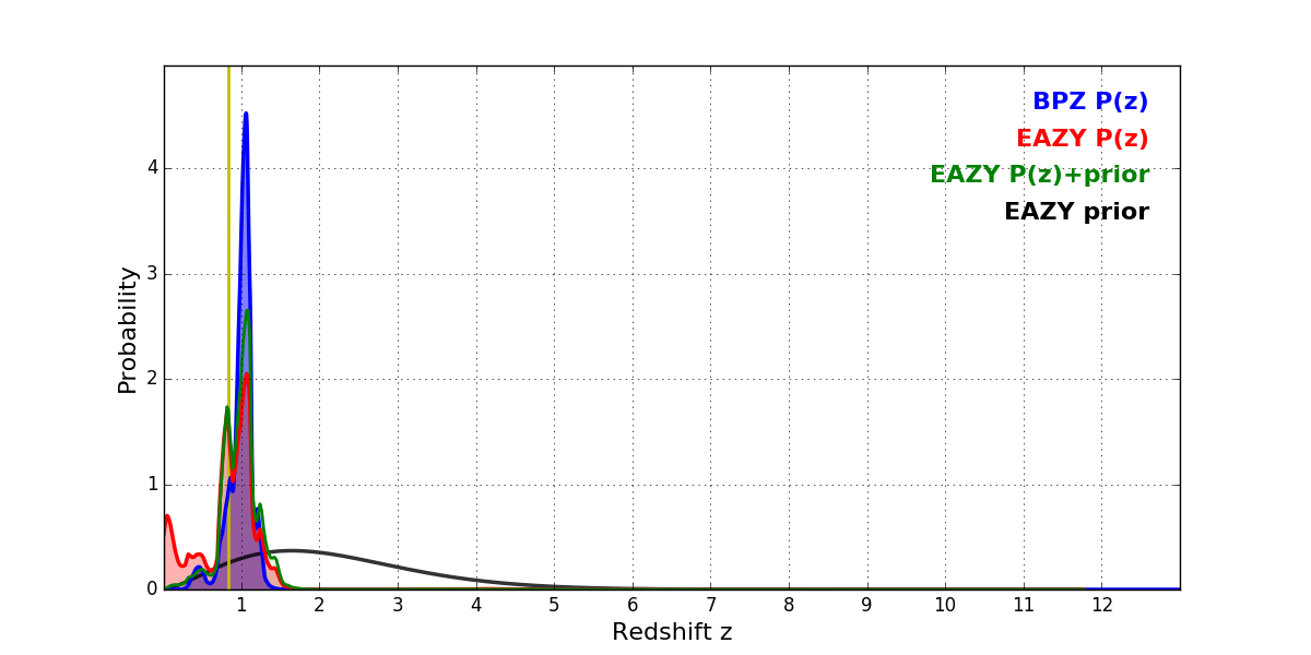 In P(z) plots: Yellow lines mark the cluster redshift z = 0.833,