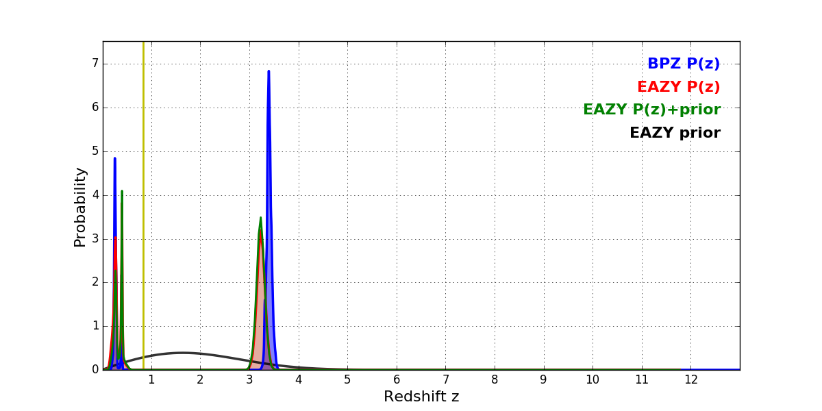 In P(z) plots: Yellow lines mark the cluster redshift z = 0.833,