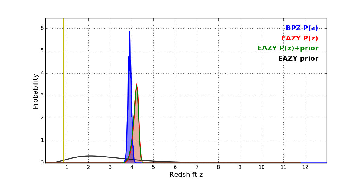 In P(z) plots: Yellow lines mark the cluster redshift z = 0.833,