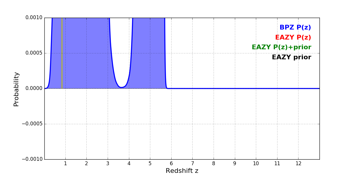 In P(z) plots: Yellow lines mark the cluster redshift z = 0.833,