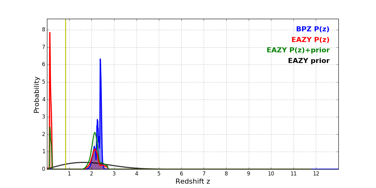In P(z) plots: Yellow lines mark the cluster redshift z = 0.833,