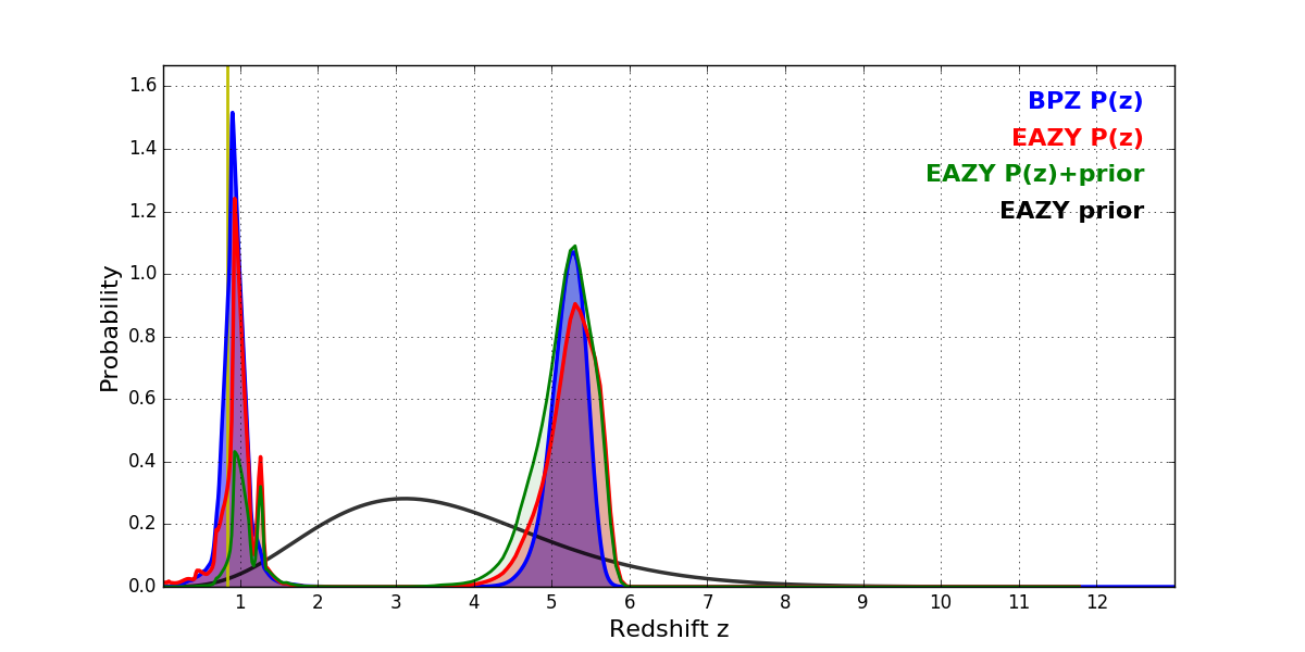 In P(z) plots: Yellow lines mark the cluster redshift z = 0.833,