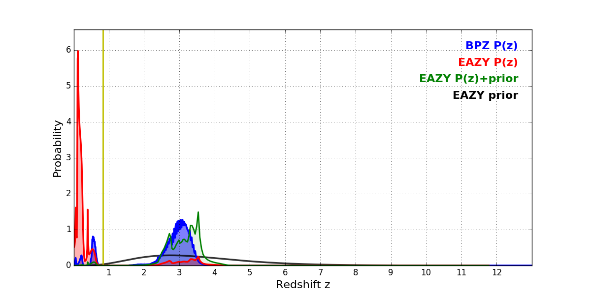 In P(z) plots: Yellow lines mark the cluster redshift z = 0.833,