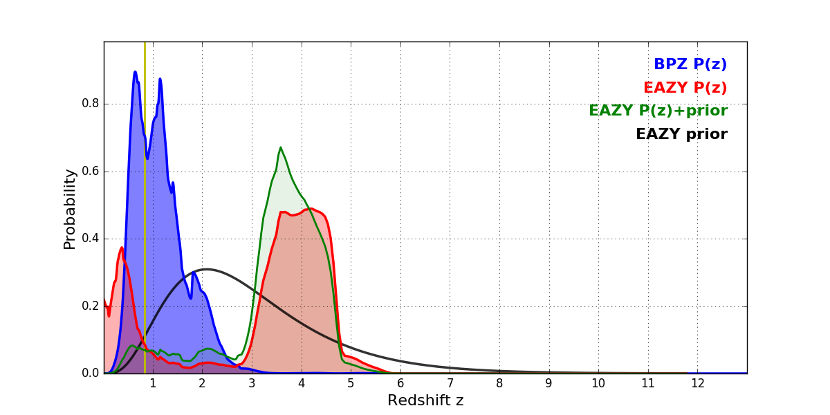 In P(z) plots: Yellow lines mark the cluster redshift z = 0.833,