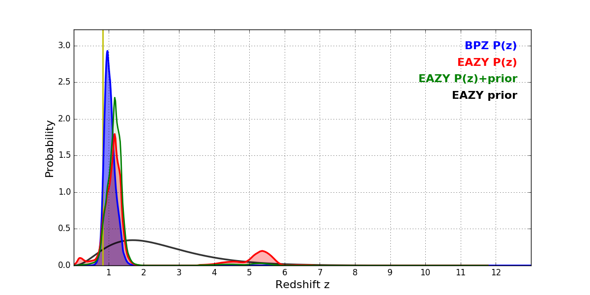 In P(z) plots: Yellow lines mark the cluster redshift z = 0.833,