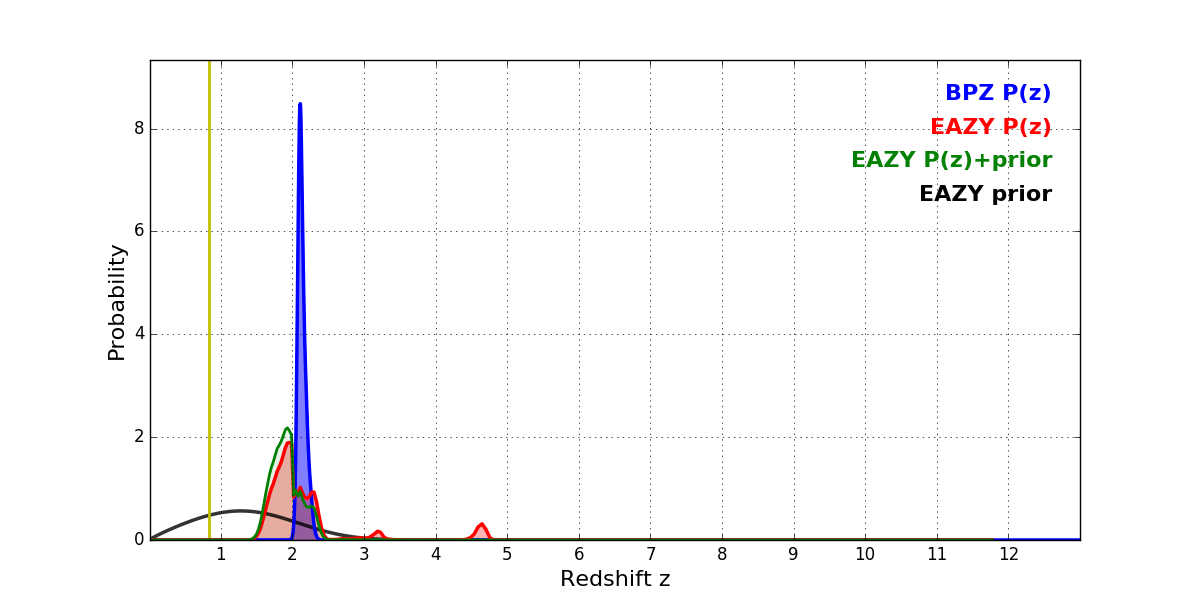In P(z) plots: Yellow lines mark the cluster redshift z = 0.833,