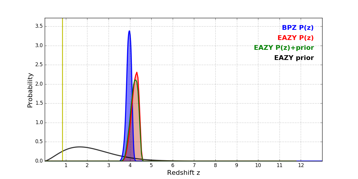 In P(z) plots: Yellow lines mark the cluster redshift z = 0.833,