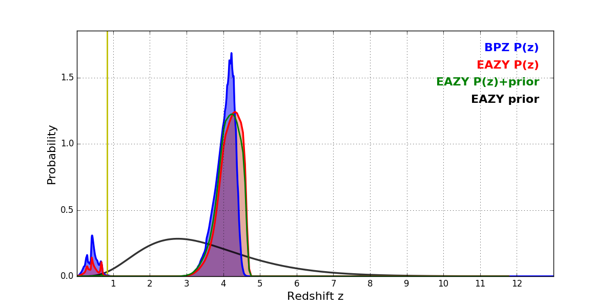 In P(z) plots: Yellow lines mark the cluster redshift z = 0.833,