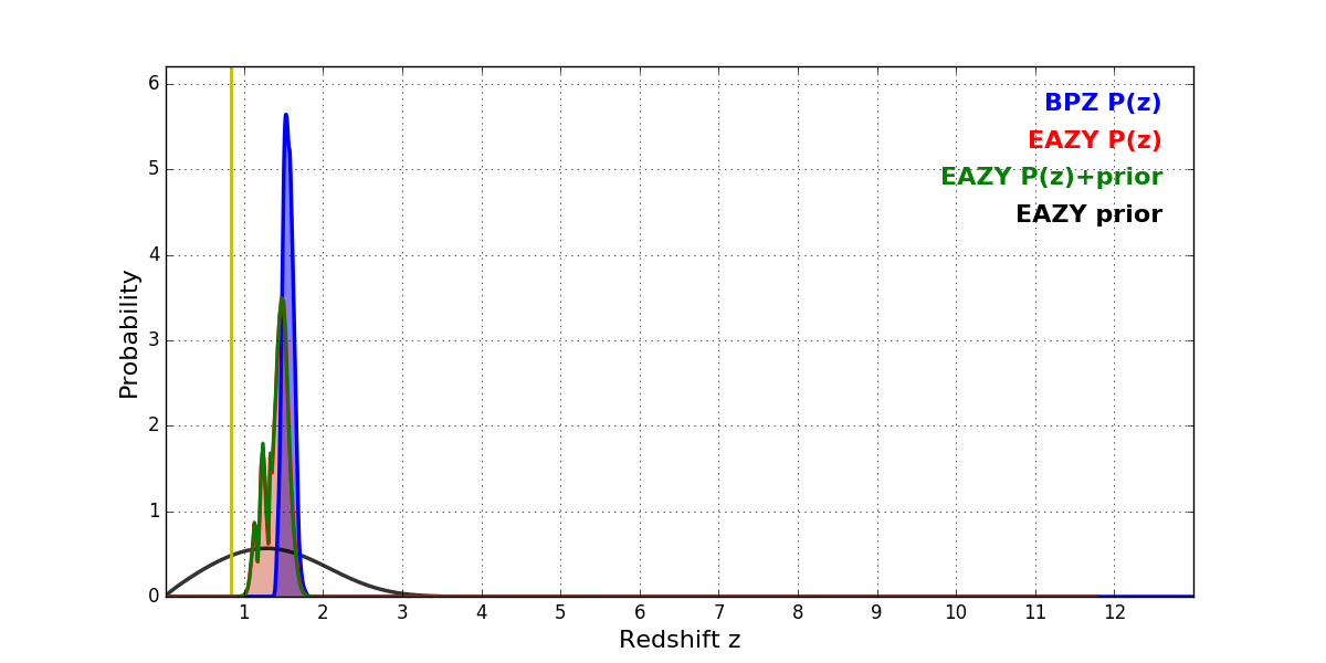 In P(z) plots: Yellow lines mark the cluster redshift z = 0.833,