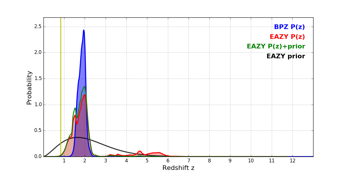 In P(z) plots: Yellow lines mark the cluster redshift z = 0.833,